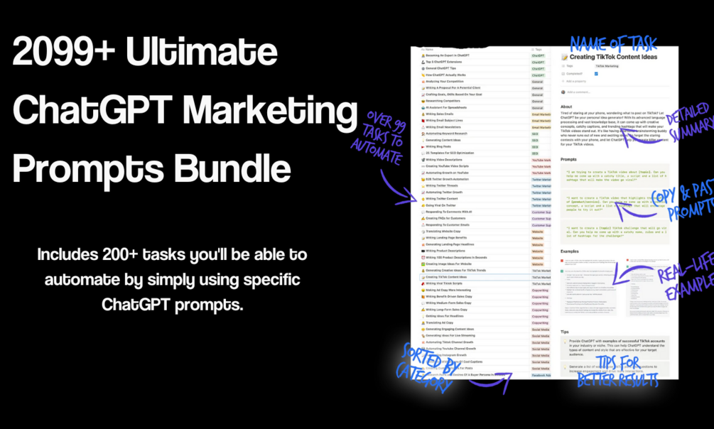 - Anything from analyzing your competition to crafting goals & OKRs, to writing blog posts and generating content ideas. Our ChatGPT Marketing Pack includes over 200+ actionable tasks you can automate using ChatGPT. And it includes more than 1099 prompts to go with all of these tasks.