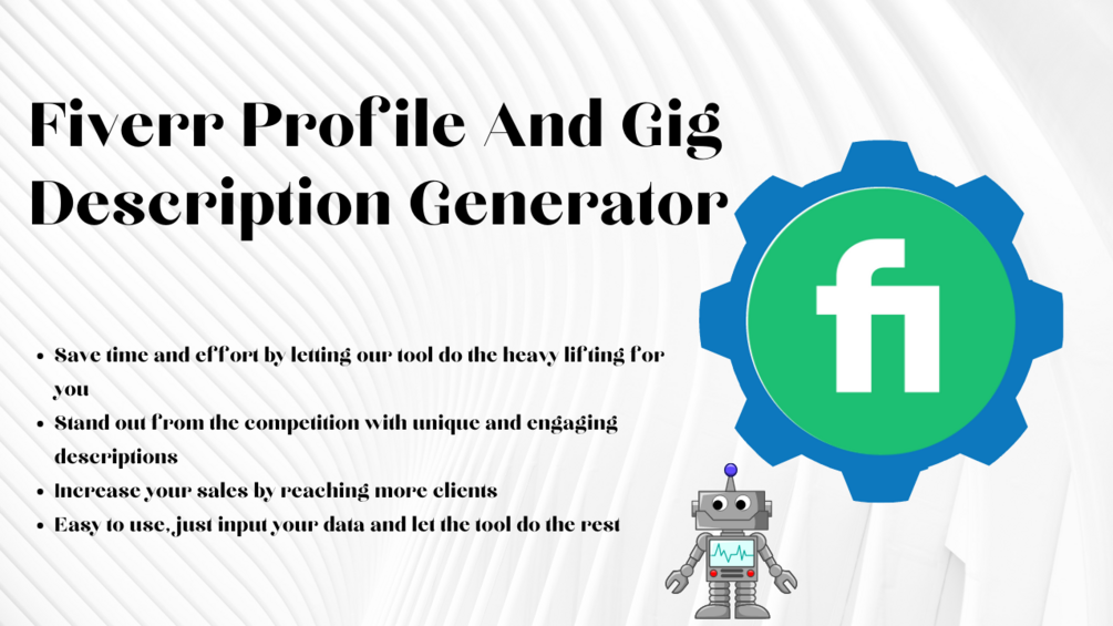 Introducing the Fiverr Profile and Gig Description Generator - the ultimate tool for generating professional and compelling Fiverr profiles and gig descriptions. With just a few clicks, our AI-powered tool will analyze your data and craft custom descriptions that will help you attract more clients and increase your sales.